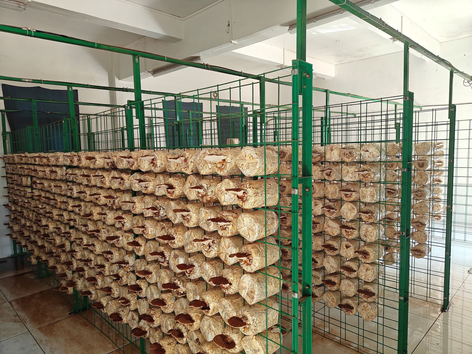 烧毁的校舍被改变成灵芝培植室,绿色的铁架子上挂满了菌棒。