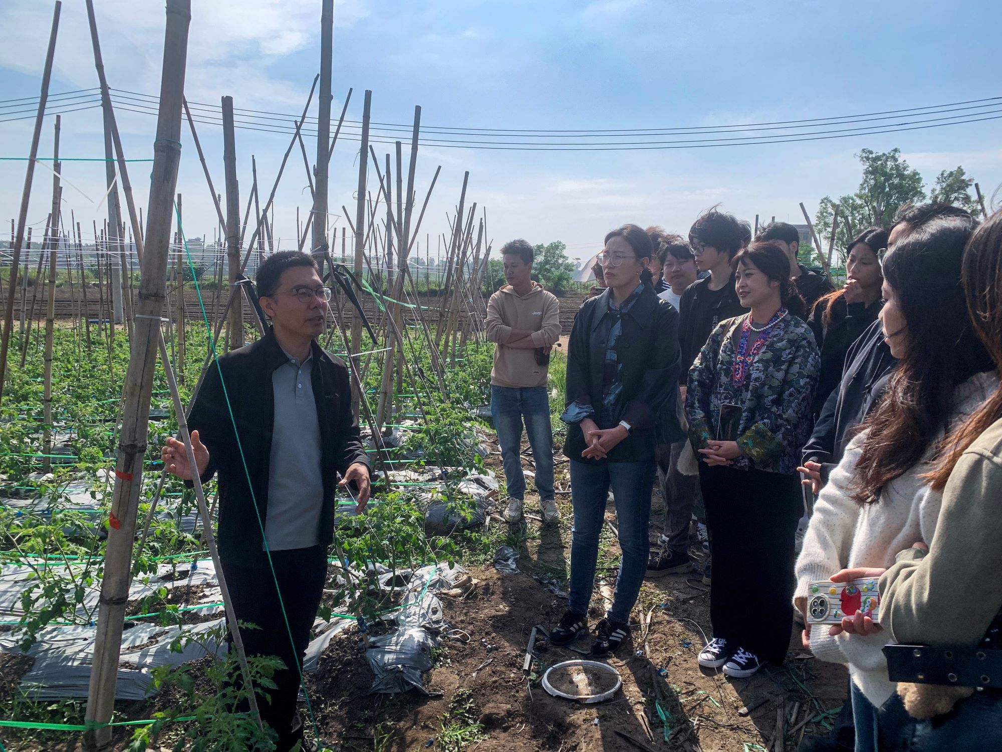 张庭瑞(左一)向湛江科技学院团队先容界炮镇圣女果产业发展情况。